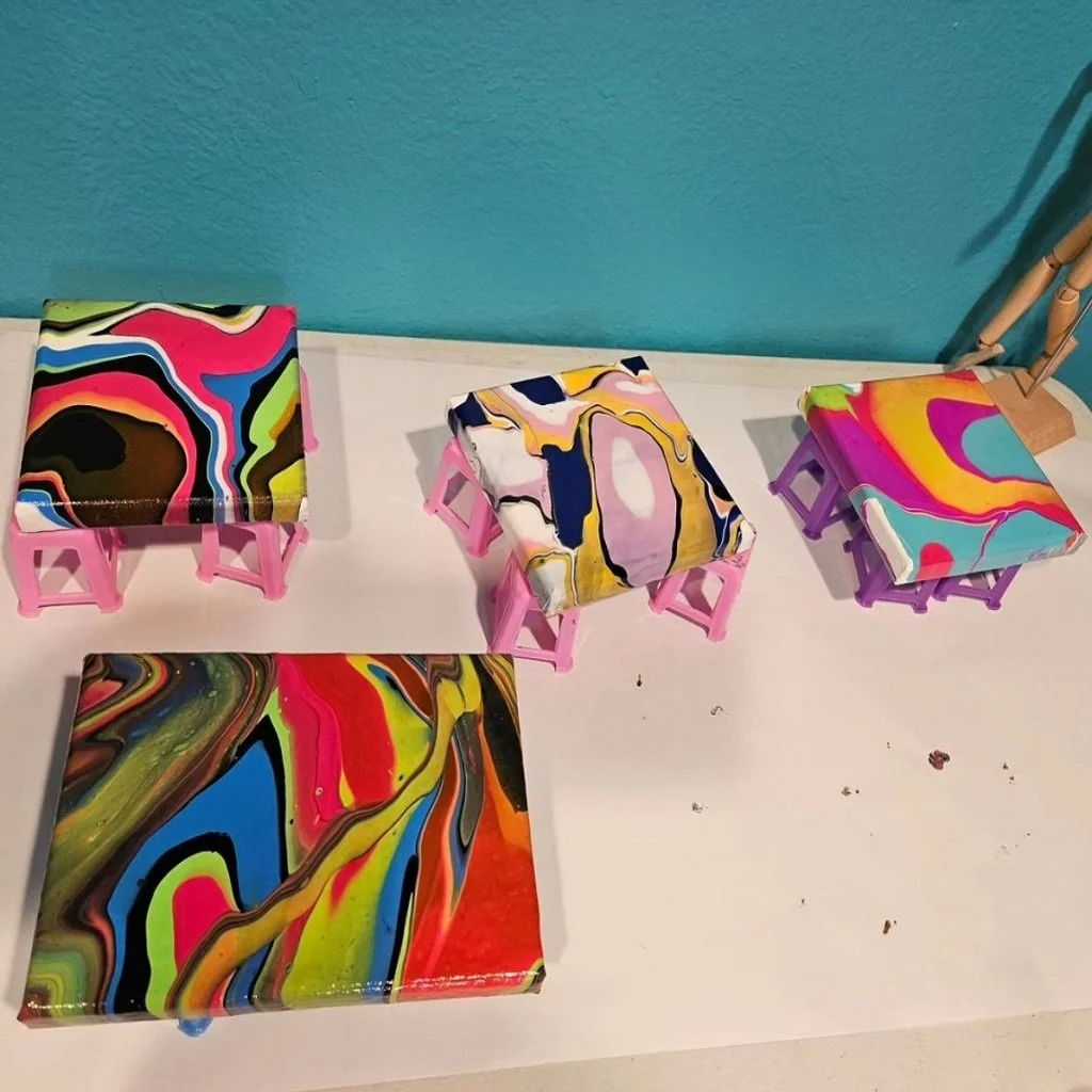 The outcome is a unique swirled painting on the canvas. I did not have formal training to make these products, I have just always enjoyed art and have taken various art classes since starting school. My goal for this company is just to share my products with other people who share a love for physical books and enjoy art.