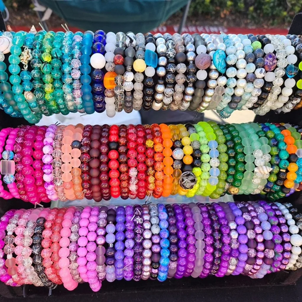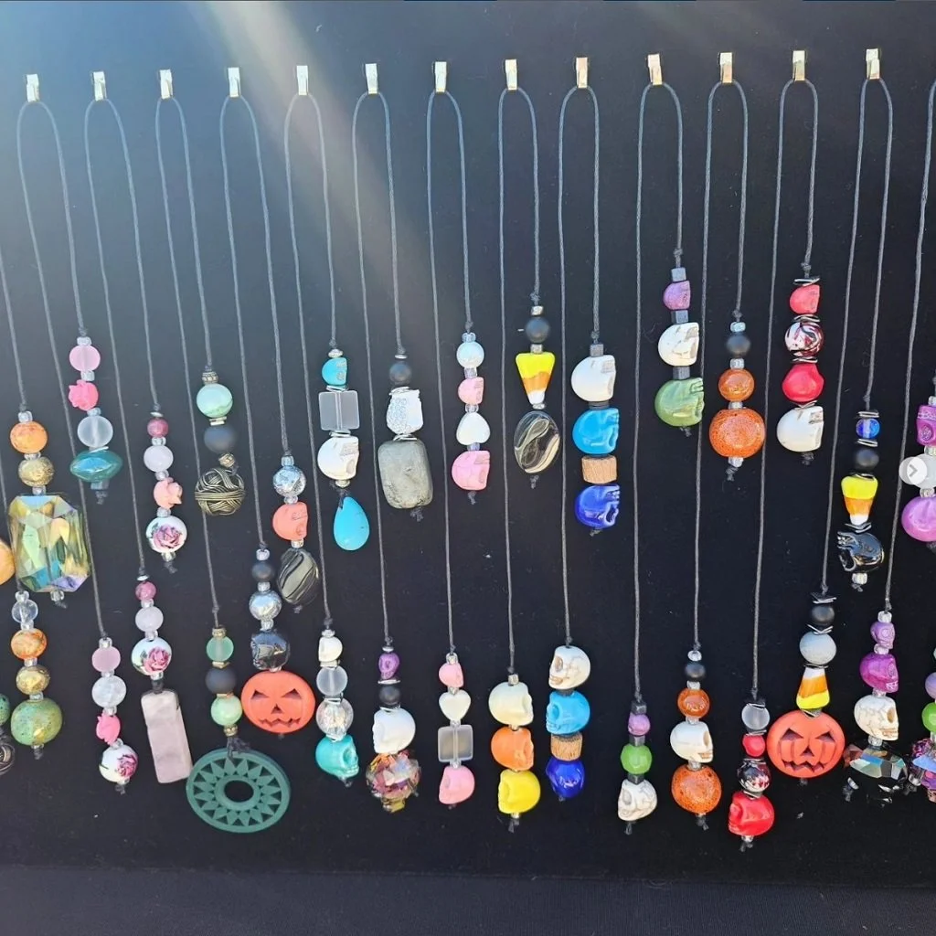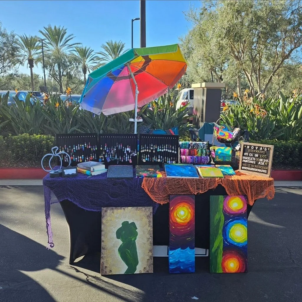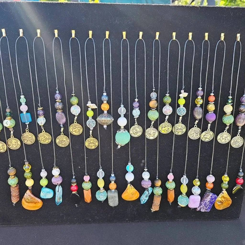 I sell various unique and artistic products. My main focus is string bookmarks that fit standard hardcover and paperback books. These bookmarks have various colored jewels and pendants and either side that can fit any personality. I also make bead bracelets and acrylic paintings. Some of the paintings I do myself while others are abstract paintings done by my dog Nova.
