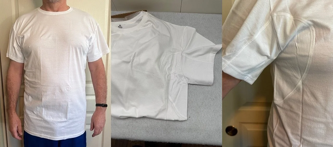 I live in SoCal, and while this isn’t Texas or Florida, the temps here can get hot here too. Now I wear T-shirts for just two reasons: as a workout shirt and as an undershirt for dressing up. For neither of these am I looking for extra bulk, so the idea of a shirt with padded underarms was not something I thought I would like. Well, I stand corrected.