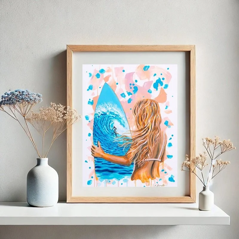 Two of my best-selling pieces are my giclée fine art prints titled "Joshua Tree Girl" and "Huntington Beach Girl". Both capture the spirit of wanderlust and the beauty of two coveted destinations that so many people hold close to their hearts. Joshua Tree Girl embodies adventure and serenity within the desert landscape, while Huntington Beach Girl radiates the "California Cool" in coastal living and ocean sunsets.